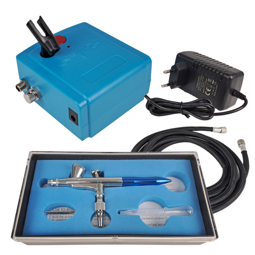 Dieser öl- und wartungsfreie Airbrush Kompressor Set Carry I ist Mini-Airbrush-Kompressor mit Autostop-Funktion und einem integrierten 360°-Airbrushpistolen-Halter. Der Airbrushkompressor ist für Arbeiten mit allen handelsüblichen Airbrush Farben geeignet. Mit nur 47dB ermöglicht er angenehmes Arbeiten auch in kleineren, geschlossenen Räumen. Dieser kompakte Kompressor ist perfekt geeignet um kleinere Arbeiten auch unterwegs zu erledigen. Die Anwendungsgebiete gehen über Nagel Design, Lebensmittel wie Torten, Blumen und Gestecke, bis zu feinen Modellbau Projekten.